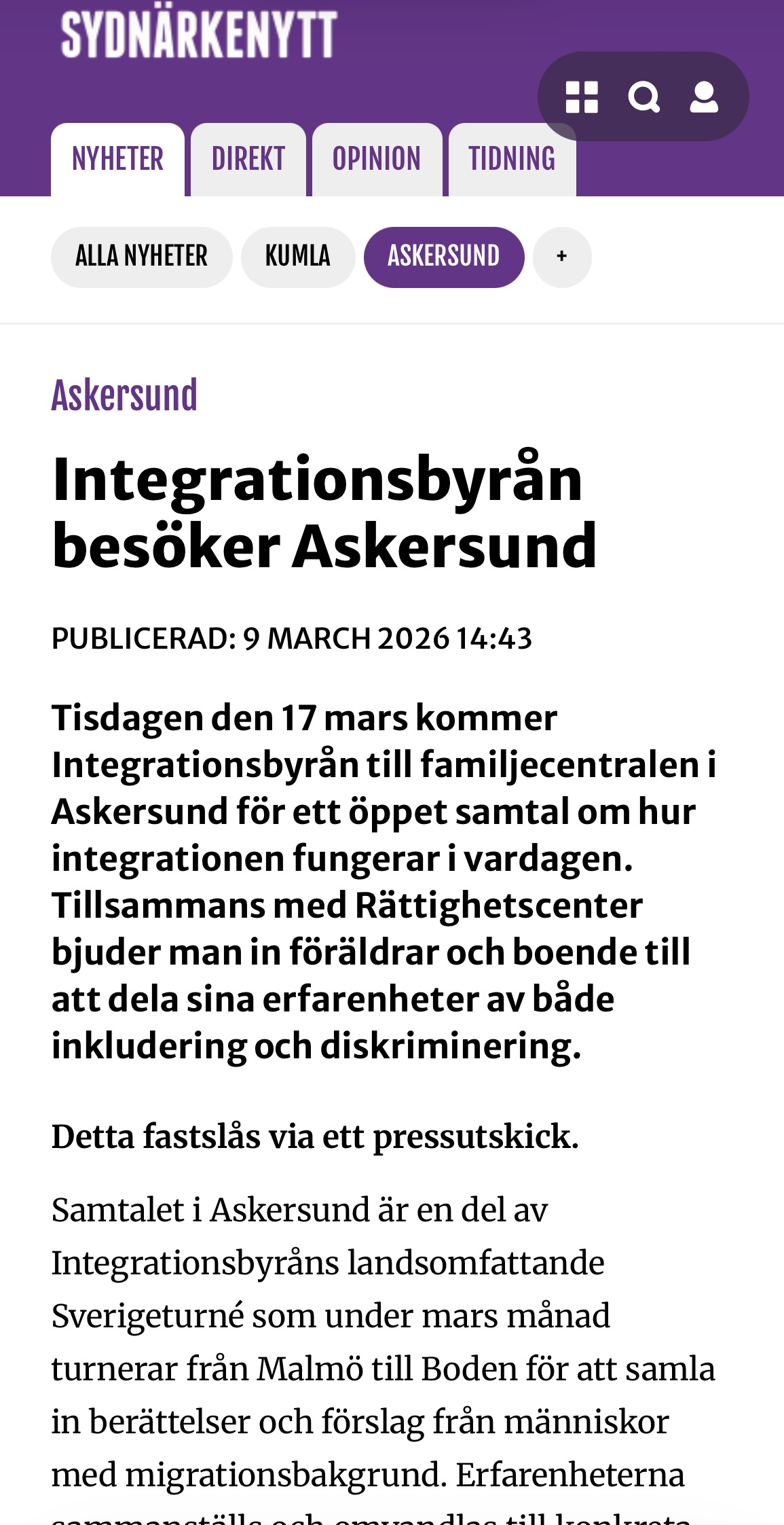 Sydnärkenytt skriver om att vi kommer till Askersund den 17 mars.