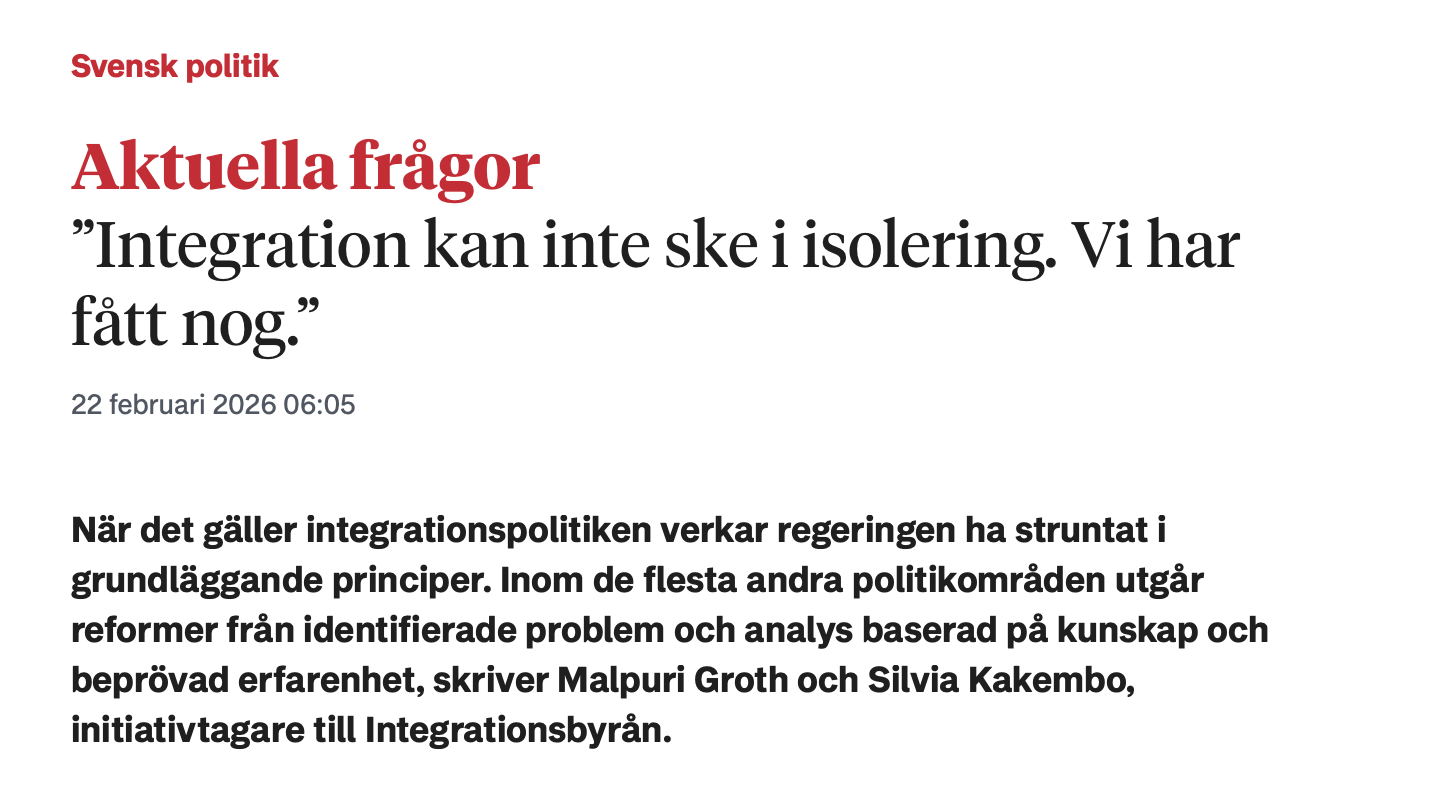 I den här debattartikeln kommenterar vi dagens integrationspolitik. Vi beskriver vi bakgrunden till och målet med Integrationsbyrån.